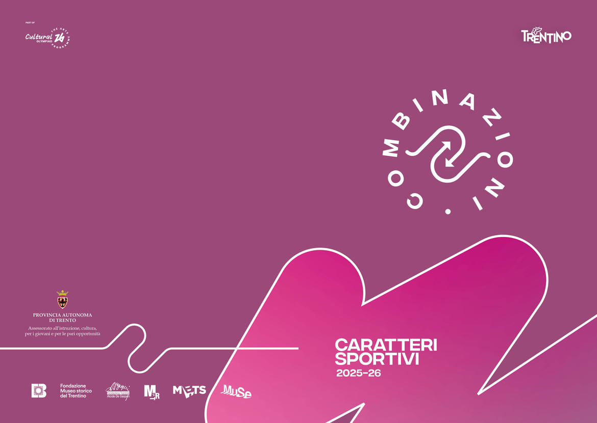 Combinazioni_caratteri sportivi è un progetto di sistema ideato e curato dall’Assessorato alla Cultura della Provincia autonoma di Trento con la collaborazione di Trentino Marketing e realizzato in sinergia con sei realtà culturali del territorio provinciale. Per il suo programma multidisciplinare, plurale e diffuso si inserisce nell’ambito di Olimpiade Culturale di Milano Cortina 2026, che promuove i valori Olimpici e Paralimpici attraverso la cultura, il patrimonio e lo sport.