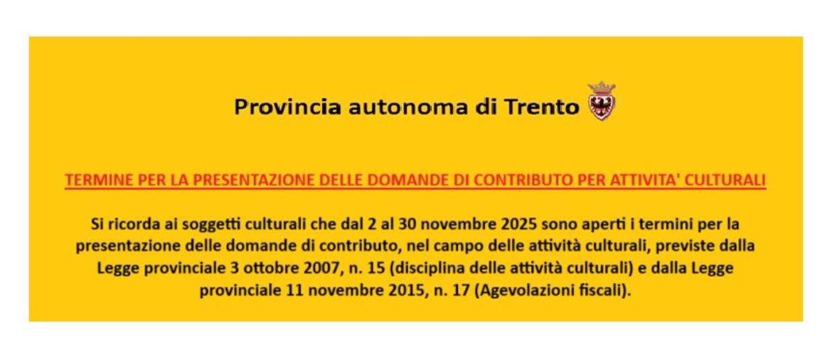 Si ricorda ai soggetti culturali che dal 2 al 30 novembre 2025 sono aperti i termini per la presentazione delle domande di contributo, nel campo delle attività culturali, previste dalla Legge provinciale 3 ottobre 2007, n. 15 (disciplina delle attività culturali) e dalla Legge provinciale 11 novembre 2015, n. 17 (Agevolazioni fiscali).