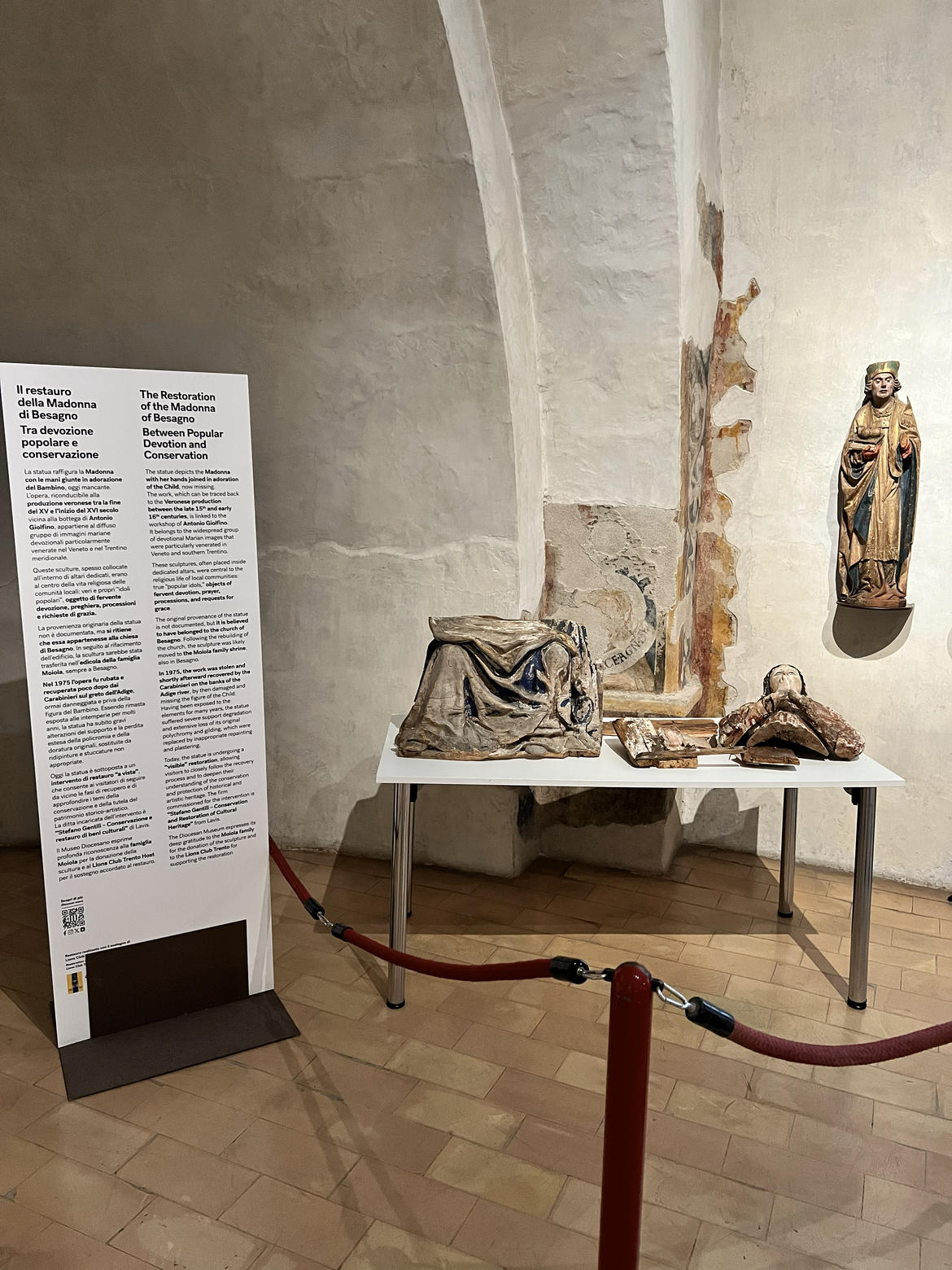 Nel 1975 l’opera fu rubata e successivamente ritrovata dai Carabinieri sulle rive dell’Adige, ormai danneggiata e priva della figura del Bambino. L’esposizione agli agenti atmosferici e interventi non idonei hanno causato gravi danni strutturali e la perdita di gran parte della policromia originale. Da oggi, grazie al laboratorio di restauro “Stefano Gentili – Conservazione e restauro di beni culturali”, i visitatori potranno assistere in diretta alle delicate fasi di recupero, approfondendo così i temi della tutela e valorizzazione del patrimonio d’arte sacra locale.