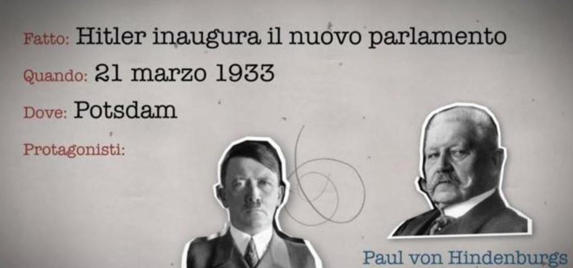 Il 21 marzo 1933 a Potsdam viene inaugurato il nuovo Parlamento tedesco, in seguito alle elezioni del 5 marzo. È il momento dell'incontro tra il nuovo cancelliere Adolf Hitler e il presidente Hindenburg; è il momento in cui il nazismo, formalmente in modo «democratico», arriva al potere.