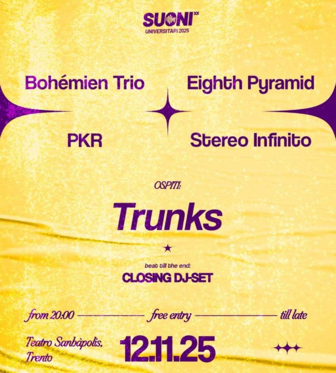 L'evento si concluderà con l’esibizione dei Trunks, gruppo vincitore della passata edizione di Suoni.
