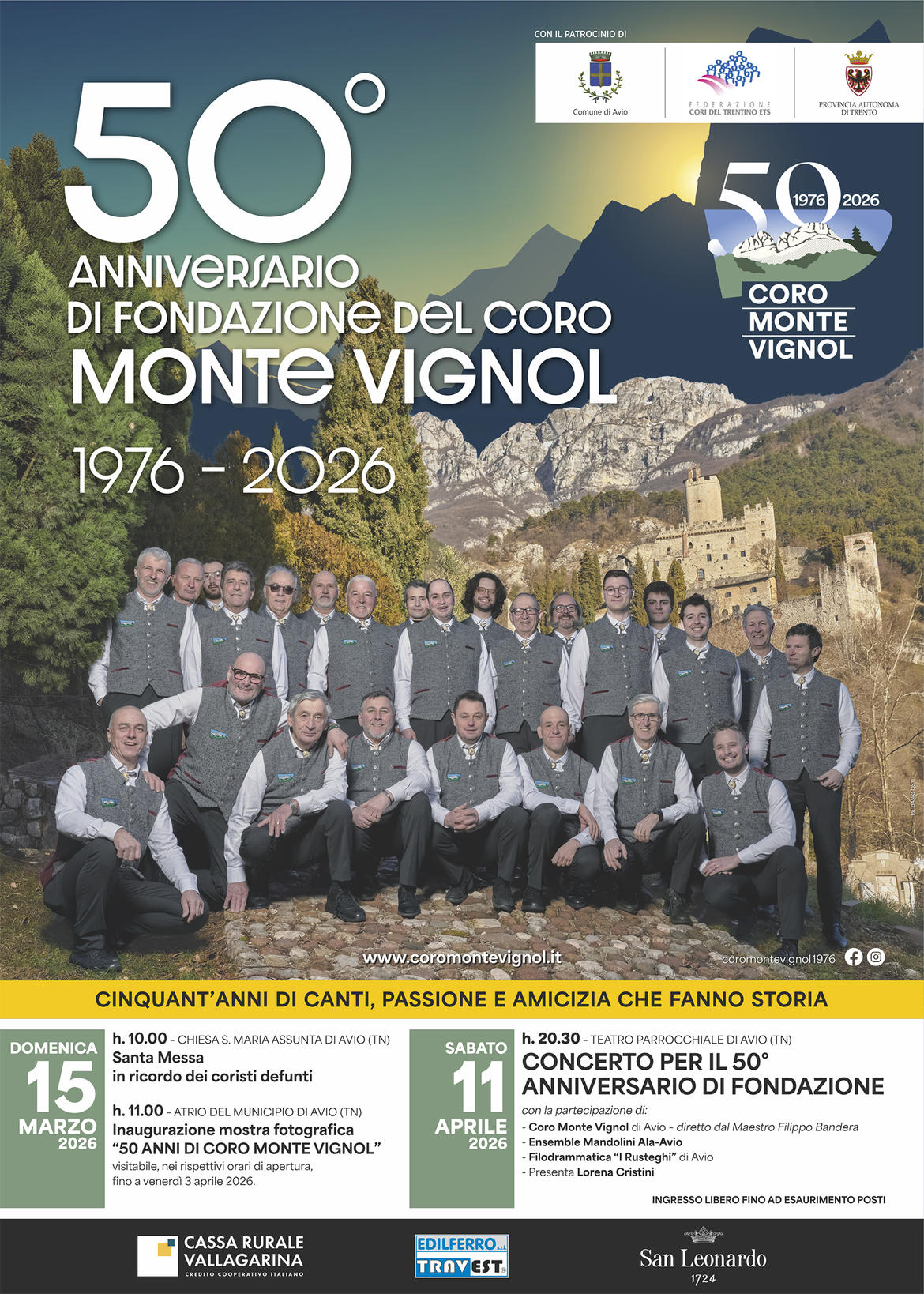 Il Coro Monte Vignol prende nome da una delle cime che si ergono sopra il Comune di Avio, nel basso Trentino, dove storia, tradizione e natura si fondono in un paesaggio di rara bellezza. Questa cima domina la vallata con il suo verde rigoglioso, e sulle sue pendici troneggia il Castello di Avio, una delle fortificazioni medievali più suggestive della regione, con le sue mura imponenti e il mastio che svetta tra i vigneti che si estendono verso la pianura. In questo scenario che nasce l'amore per il canto popolare e di montagna. Qui il canto è espressione dell'anima, una tradizione che racconta le storie della gente, delle loro vite e delle loro radici profondamente legate alla terra e alla montagna.