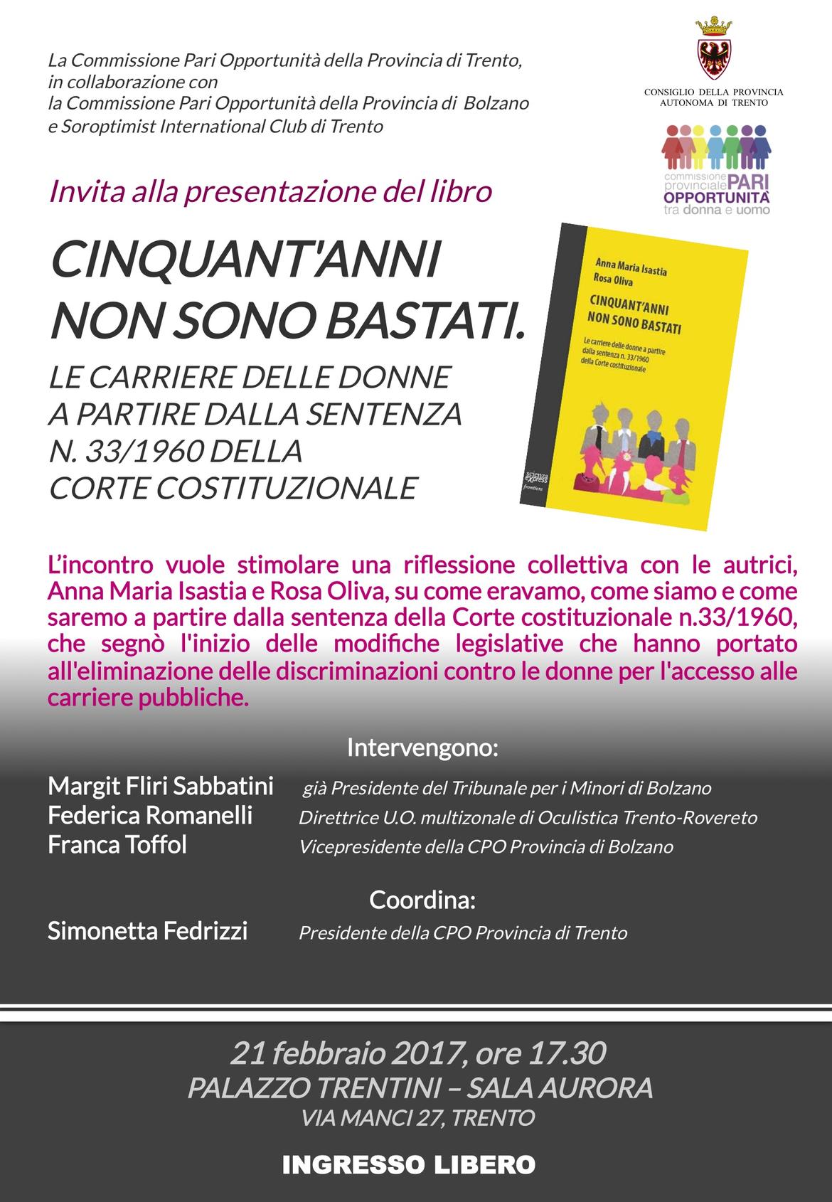 L’incontro vuole stimolare una riflessione collettiva con le autrici, Anna Maria Isastia e Rosa Oliva, su come eravamo, come siamo e come saremo a partire dalla sentenza della Corte costituzionale n.33/1960, che segnò l'inizio delle modifiche legislative che hanno portato all'eliminazione delle discriminazioni contro le donne per l'accesso alle carriere pubbliche.