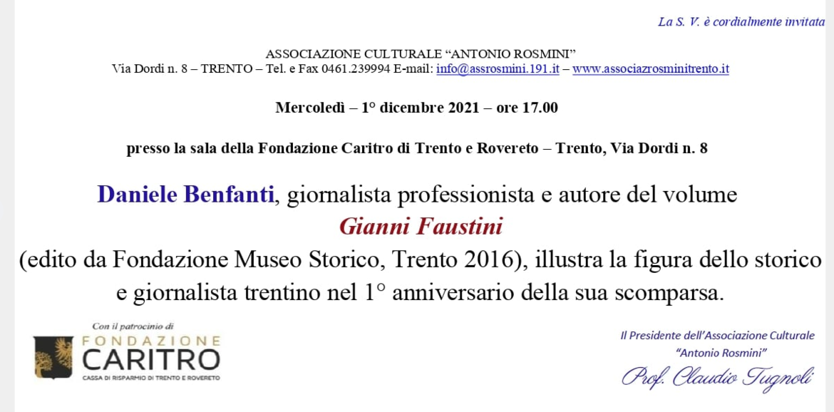 Daniele Benfanti, giornalista professionista e autore del volume Gianni Faustini (edito da Fondazione Museo Storico, Trento 2016), illustra la figura dello storico e giornalista trentino nel 1° anniversario della sua scomparsa