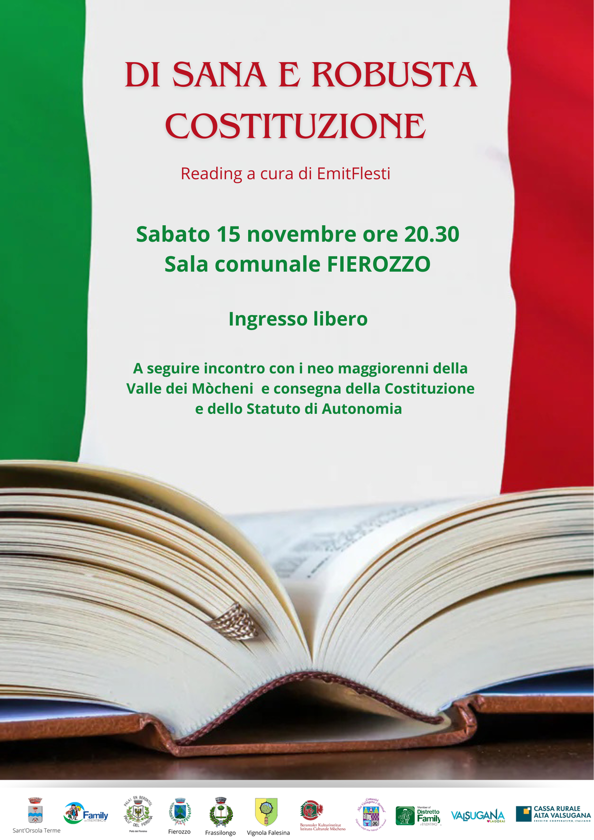Nell'ambito del progetto sovracomunale “Cultura in rete”, sabato 15 novembre alle ore 20.30 presso la Sala comunale di Fierozzo andrà in scena il reading teatrale “Di sana e robusta Costituzione".