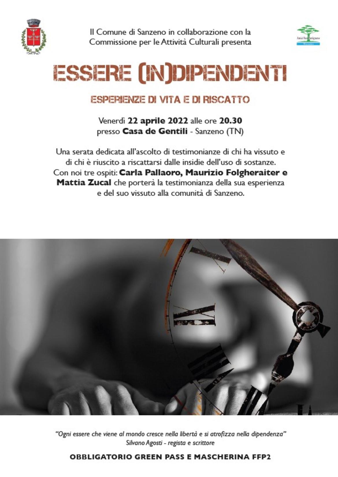 Il 22 aprile 2022 alle ore 20:30 in Casa de Gentili a Sanzeno (Val di Non) si terrà un'incontro-testimonianza in collaborazione con l'associazione "Amici di San Patrignano" di Lavis. Dettagli nell'allegato.