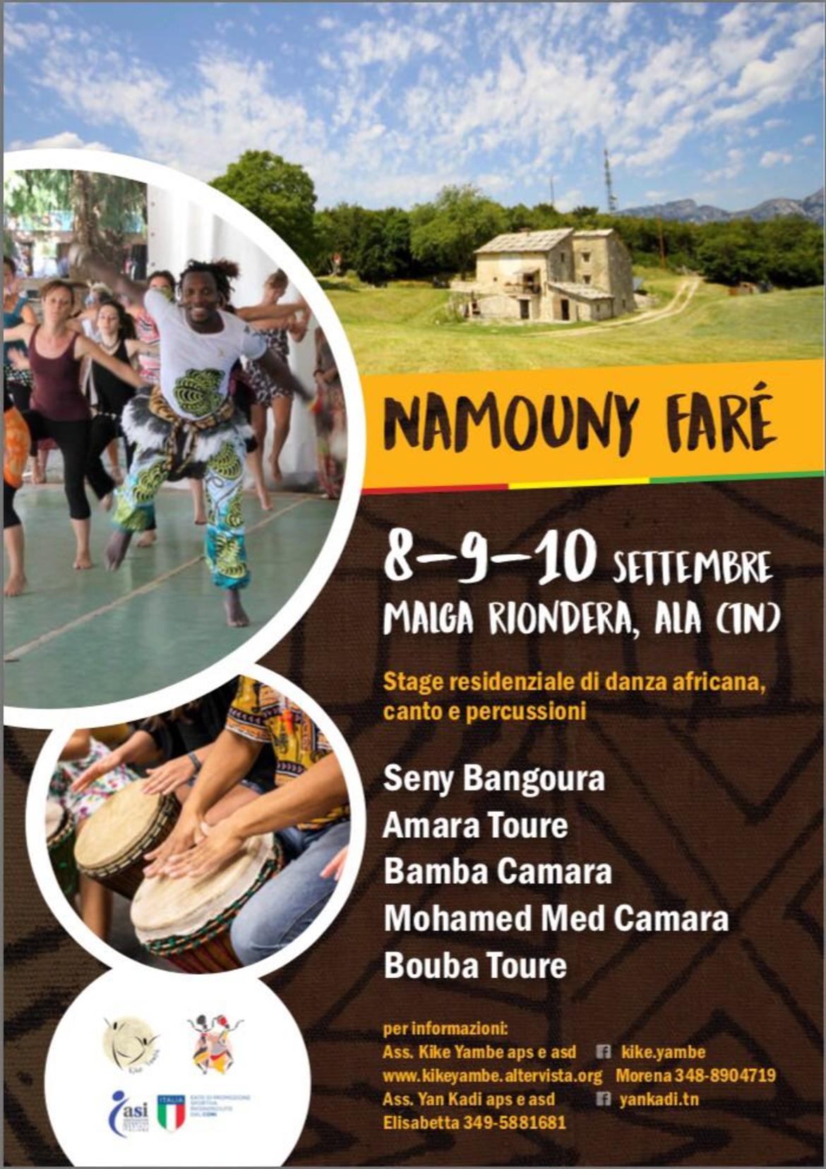 Da venerdì 8 a domenica 10 settembre 2017 presso l'antico rustico di Malga Riondera, poco sopra il centro abitato di Ala, si svolge la prima edizione del “Festival Namounyi Farè”, rassegna incentrata sulla cultura tradizionale di Guinea e Mali. Il festival è proposto dalle associazioni Yan Kadi Aps e Asd di Trento, Kike Yambe Aps e Asd di Arco e Aps Giardino delle Arti di Trento.