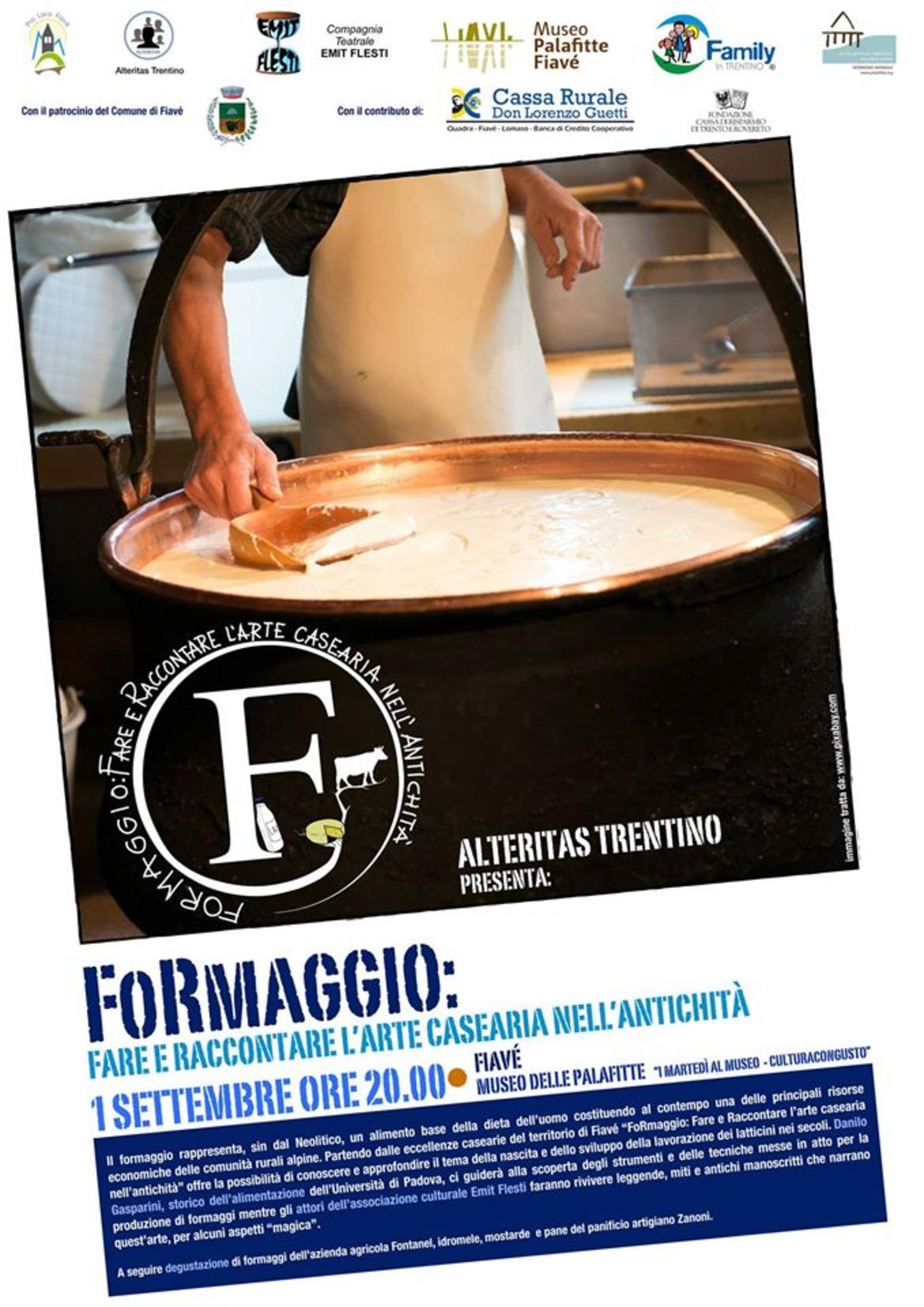 Proseguono al Museo delle Palafitte di Fiavé gli appuntamenti nell'ambito de "I Martedì al Museo. Cultura con gusto" ideati e curati dalla Pro Loco di Fiavé. Martedì 1 settembre alle ore 20 sarà la volta di "FoRmaggio: Fare e Raccontare l'arte casearia nell'antichità, una conferenza-spettacolo dedicata all'antichissima arte di "saper fare il formaggio". La serata vedrà affiancati lo storico dell'alimentazione Danilo Gasparini, dell'Università degli Studi di Padova, e gli attori Alessio Dalla Costa e Annalisa Morsella dell'Associazione culturale Emit Flesti. Protagonista sarà il formaggio che verrà spiegato nei suoi aspetti storici e tecnici e raccontato, grazie alle letture degli attori, prendendo in prestito le parole di scrittori antichi e moderni. Seguirà la degustazione di formaggi, insigniti del Premio Medusa, dell'Azienda agricola Fontanel di Fiavé, accompagnata da pane del panificio Zanoni di Ponte Arche e da idromele Chimere.