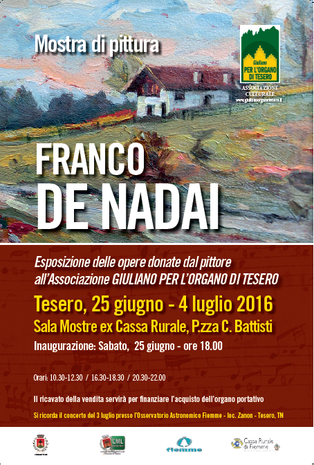 Sabato 25 giugno alle ore 18 presso la Sala mostre dell'ex Cassa Rurale verrà inaugurata l'esposizione delle opere donate dal pittore De Nadai all'Associazione Giuliano per l'Organo di Tesero.