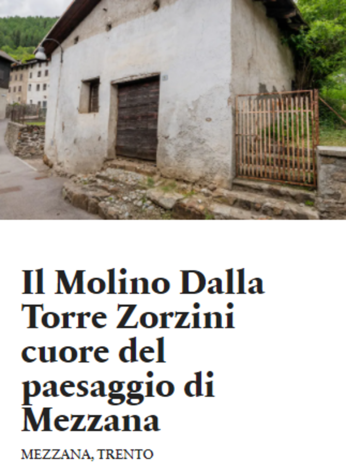 IL MOLINO ZORZINI Luogo del Cuore del FAI, il molino rappresenta uno dei tre opifici addetti alla macinazione presenti in passato nel paese di Mezzana, l'unico ancora perfettamente integro. Appartenne a diverse famiglie, in particolare ai Dalla Torre contraddistinti dal soprannome di "Zorzìni", in altre parole "i discendenti di Giorgio". Documentato dall'inizio dell'Ottocento, il molino rimase in attività fino al 1965, quando morì l'ultimo mugnaio Giovanni Dalla Torre. All'esterno l'edificio non presenta caratteristiche peculiari che permettano di riconoscerlo come un molino, manca infatti la ruota, ma quest'aspetto va ricondotto agli adeguamenti tecnologici apportati negli anni Trenta del Novecento, per migliorarne la produttività. All'interno, invece, il molino conserva la coppia di macine e il pestino per l'orzo, il ventilabro e gli strumenti per garantirne l'utilizzo. Un particolare sistema di pulegge per azionare i macchinari costituisce un'altra delle particolarità di questa struttura, testimone del Tempo.