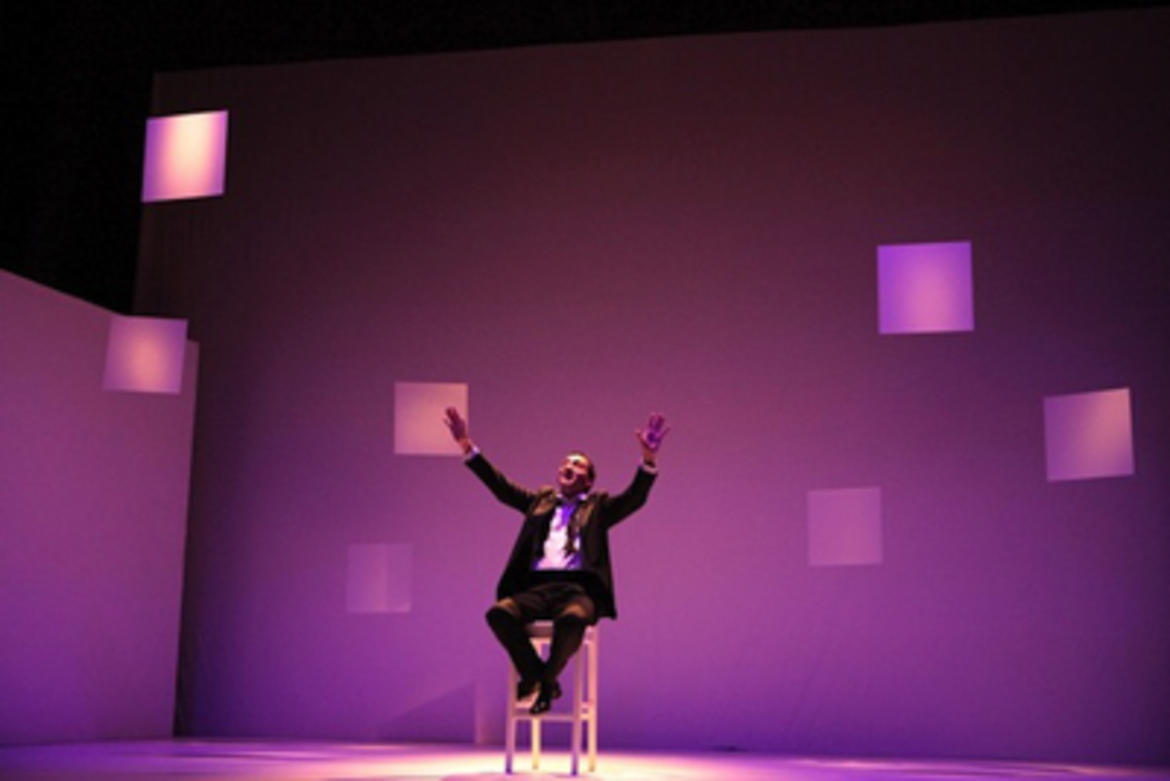 A fare da sfondo, una scena spoglia eppure densa di suggestioni: un solo sgabello e pareti bianche, che, illuminate da giochi di luce, seguono il ritmo della narrazione.