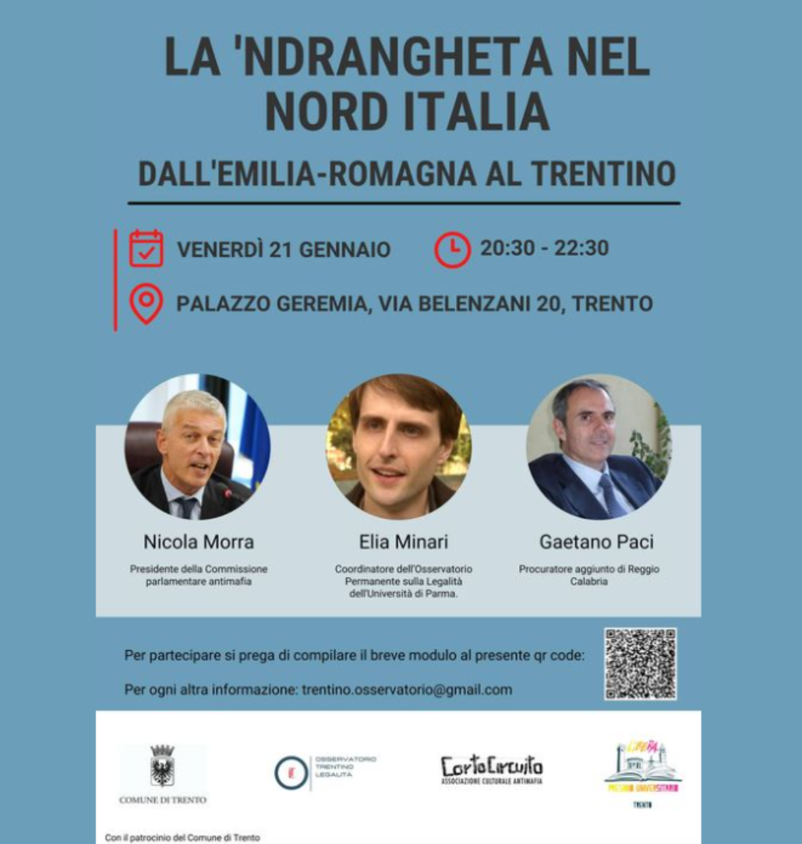 Un appuntamento a cura di Osservatorio Trentino Legalità in collaborazione con Associazione antimafia Cortocircuito e Presidio Universitario Libera "Celestino Fava" - Trento.