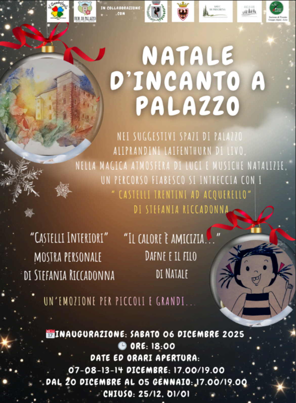 Nei suggestivi spazi del primo piano di Palazzo Aliprandini Laifenthurn di Livo, nella magica atmosfera di luci e musiche natalizie, si snoda un percorso fiabesco sul tema dell’amicizia, che viene narrata ai piccoli e alle loro famiglie con la fiaba “Dafne e il filo di Natale”.