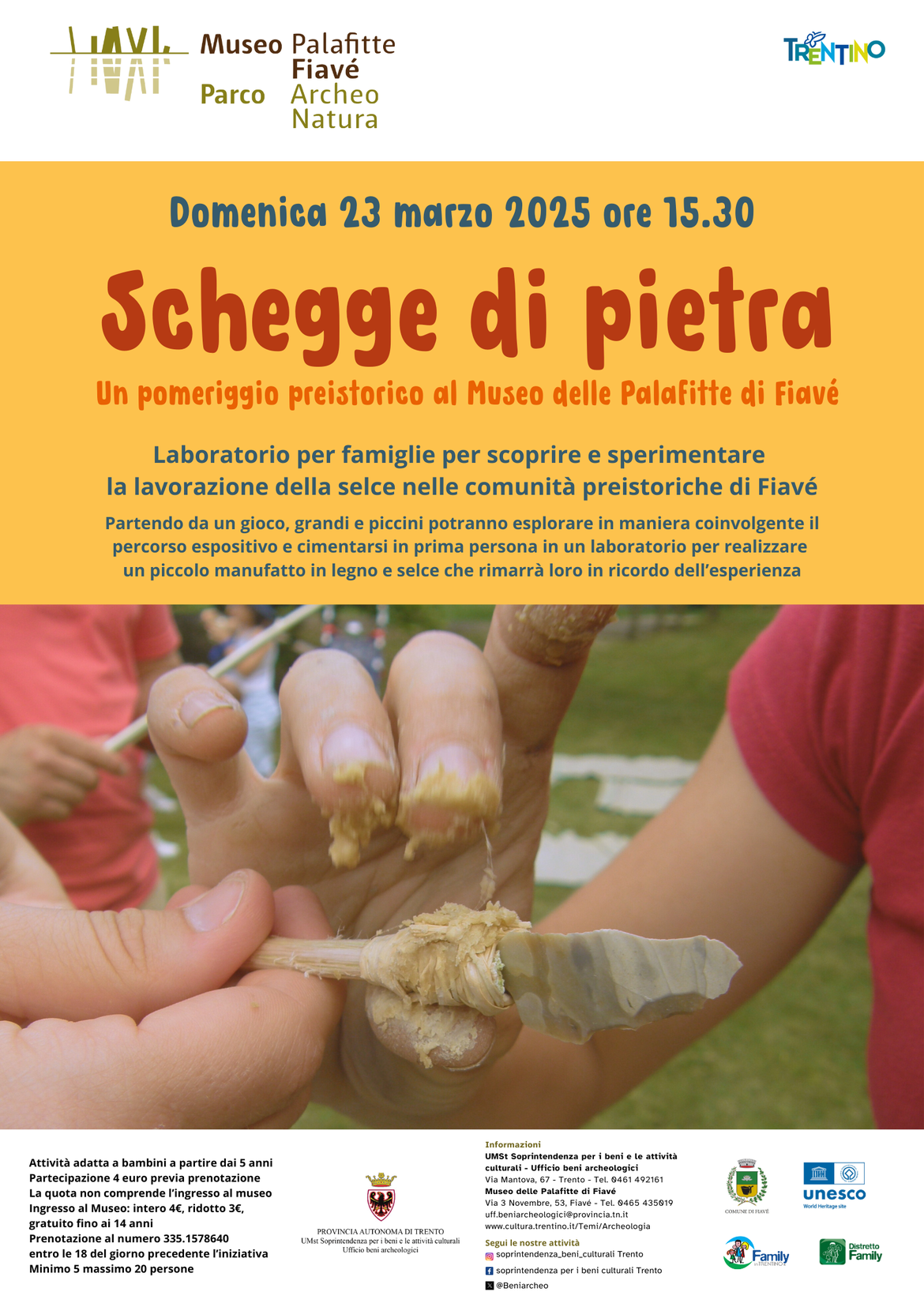 Domenica 23 marzo alle ore 15.30 il Museo delle Palafitte di Fiavé propone “Schegge di pietra”, un pomeriggio preistorico rivolto alle famiglie per scoprire e sperimentare la lavorazione della selce nelle comunità che nell’età del Bronzo vivevano sulle sponde dell’antico lago Carera. Assieme agli esperti dei Servizi Educativi dell’Ufficio beni archeologici provinciale, partendo da un gioco, grandi e piccini potranno esplorare in maniera coinvolgente il percorso espositivo e realizzare un piccolo manufatto in legno e selce che rimarrà ai partecipanti in ricordo dell’esperienza.