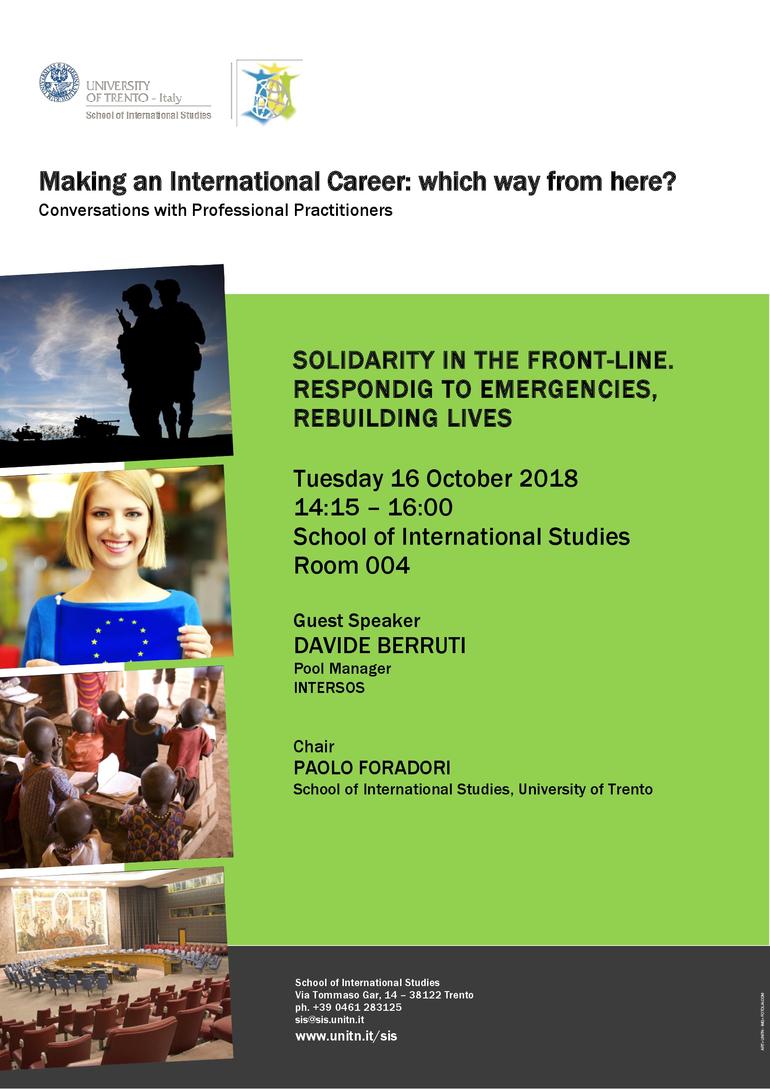 Davide Berrutti, operatore di INTERSOS, con una lunga esperienza in ambito umanitario e di ritorno dalla Nigeria, incontrerà gli studenti dell’ateneo trentino per presentare le attività della ONG e raccontare cosa significa lavorare in contesti di emergenza umanitaria. L'incontro, aperto alla cittadinanza, rientra nell'ambito dell'accordo di partenariato sottoscritto dalla Scuola di Studi Internazionali con INTERSOS. L’accordo tra la SSI e INTERSOS si basa sul comune interessa a promuovere la conoscenza nel campo della cooperazione internazionale, soprattutto in materia di assistenza umanitaria, intervento nelle emergenze e nelle crisi umanitarie, attraverso iniziative di formazione, ricerca e disseminazione, e l’attivazione di tirocini presso le sedi di INTERSOS a favore degli studenti della SSI.