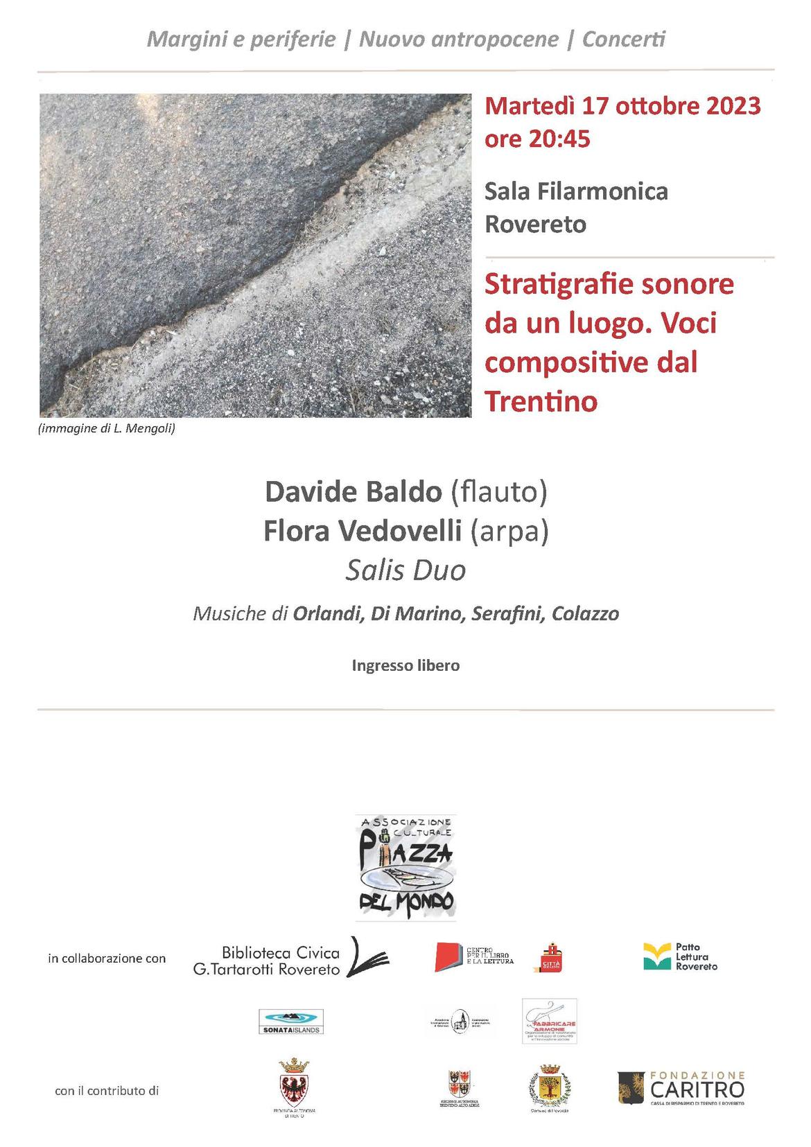 Martedì 17 ottobre 2023, alle ore 20:45, propone un concerto alla Sala Filarmonica di Rovereto, dal titolo “Stratigrafie sonore da un luogo. Voci compositive dal Trentino”, con musiche di compositori dal Trentino, Paolo Orlandi, Roberto Di Marino, Eddy Serafini, Cosimo Colazzo, interprete il Duo Salis, con Davide Baldo al flauto e Flora Vedovelli all’arpa.