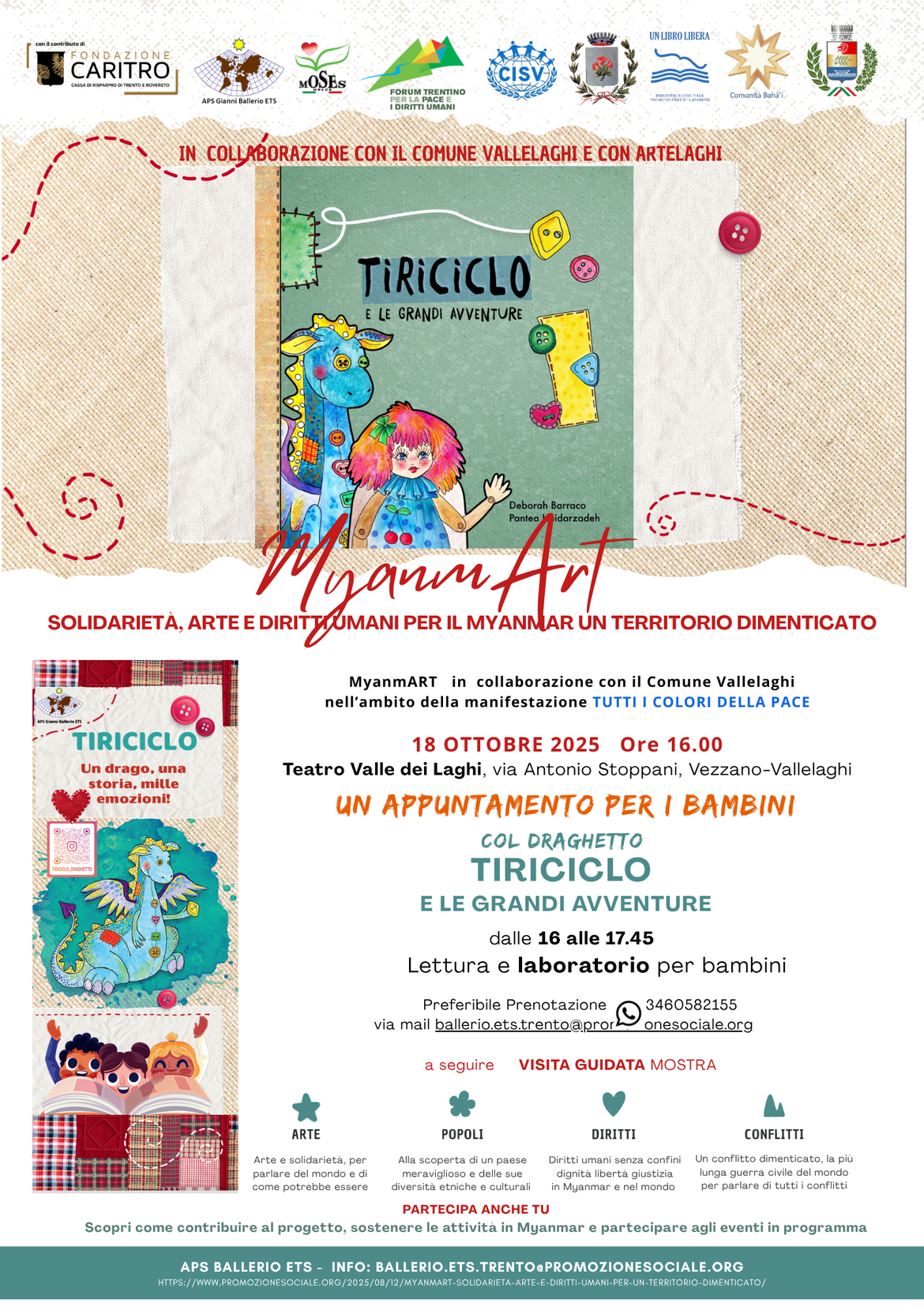 L’iniziativa, che si inserisce in un più ampio percorso di sensibilizzazione rivolto a tutta la popolazione sul tema dei diritti umani e della cittadinanza attiva, è parte del progetto MyanmART cofinanziato dalla Caritro nell’ambito del bando 2025 per il volontariato culturale e promosso da APS Ballerio ETS in collaborazione con Moses, Forum Trentino per la Pace e i Diritti Umani, Comunità Bahá’í, CISV, e una rete di associazioni, biblioteche e amministrazioni locali.