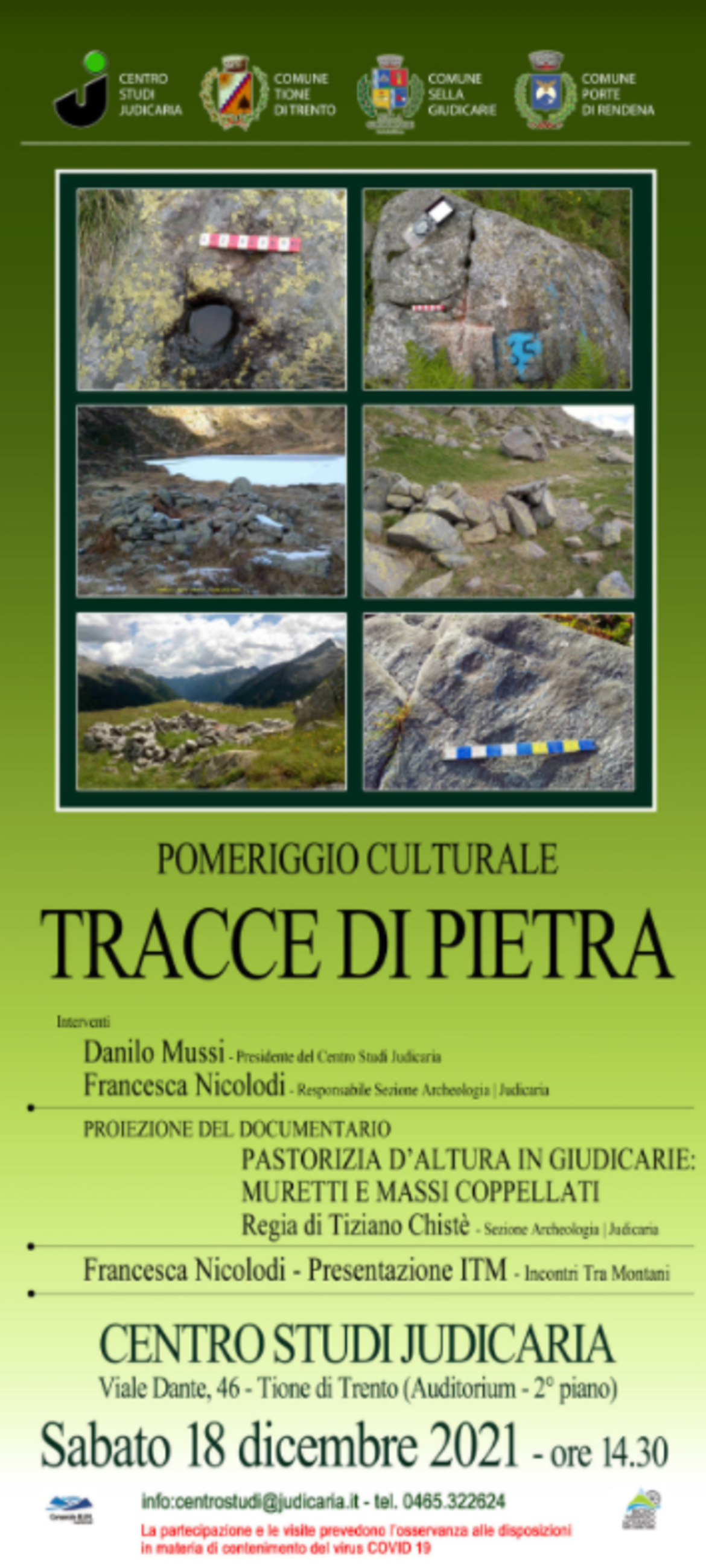 Alle ore 14:30, presso l'Auditorium di Judicaria a Tione, la responsabile della Sezione Archeologia Francesca Nicolodi farà il punto sullo stato attuale dei lavori in Giudicarie, con particolare riferimento ai massi coppellati censiti e studiati negli ultimi anni.