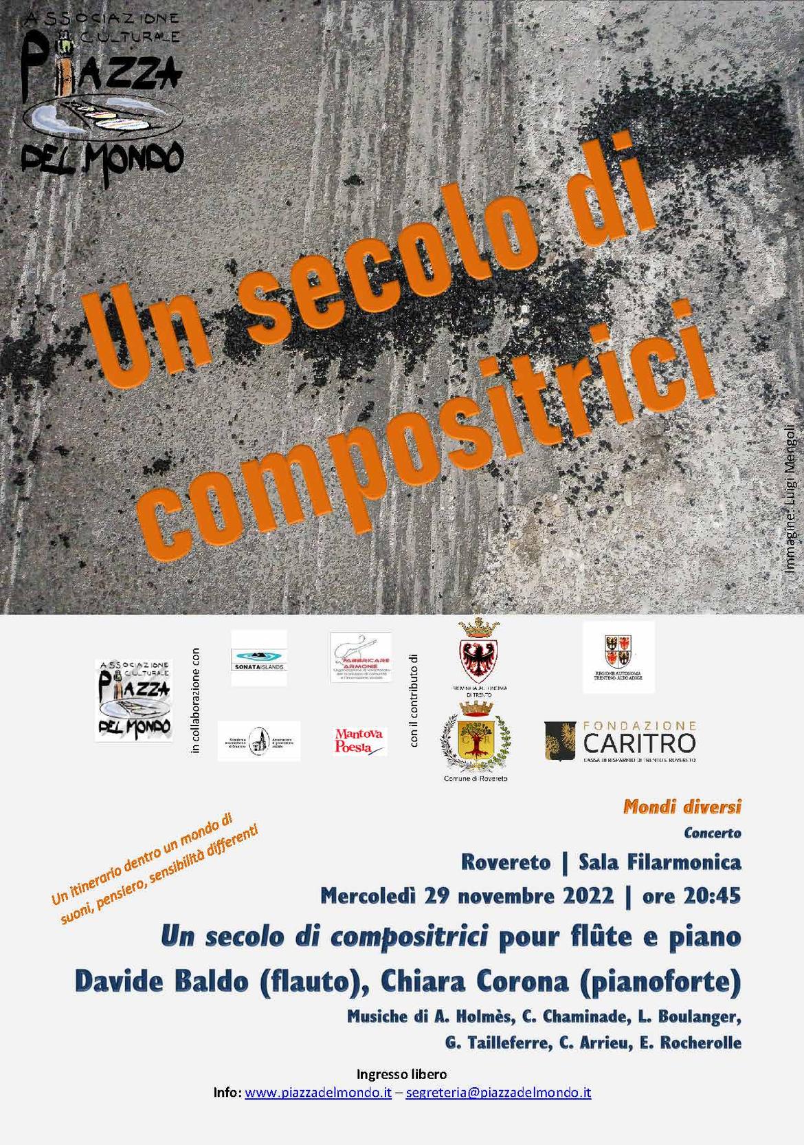 Mercoledì 30 novembre, sempre alla Sala Filarmonica di Rovereto e alle ore 20:45, un concerto, con Davide Baldo al flauto e Chiara Corona al pianoforte, ci conduce attraverso una rete di compositrici francesi del primo Novecento: anche qui un disegno di creatività alternativa e di mondi diversi.