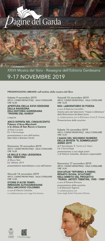 Gli appuntamenti proseguono poi con un ricco calendario: domenica 10 novembre alle ore 16 Mauro Neri propone una presentazione teatralizzata del suo libro «Le mille e una leggenda del Trentino» (Athesia, 2019), mentre giovedì 14 novembre alle ore 15 Vittorio Colombo propone «Storie d’altri tempi: immagini altogardesane dell’archivio Colombo» (in collaborazione con l’associazione Lega Vita Serena). Venerdì 15 novembre l’appuntamento è con «Noi. Laboratorio di poesia», volume a cura di Beatrice Carmellini, esito del laboratorio «Poesia in biblioteca» tenuto dalla Mnemoteca del Basso Sarca in collaborazione con la biblioteca civica «Bruno Emmert» di Arco (presentazione della curatrice, inizio alle ore 16). Sabato 16 novembre i curatori Paolo Boccafoglio, Romano Turrini e Giorgio Vivori assieme al direttore responsabile Vittorio Colombo presentano i saggi del secondo numero della rivista Il Sommolago, anno 2019 (inizio alle ore 16). La chiusura, domenica 17 novembre, è alle ore 16 con la presentazione del docufilm «Ritorno a Parigi. Renato Ischia, scultore», nell’ambito del progetto «Parigi. Artisti trentini, 1900-1989», a cura di Roberta Bonazza (presentazione della curatrice e di Giancarla Tognoni, in collaborazione con la Casa degli Artisti «Giacomo Vittone» di Canale di Tenno).