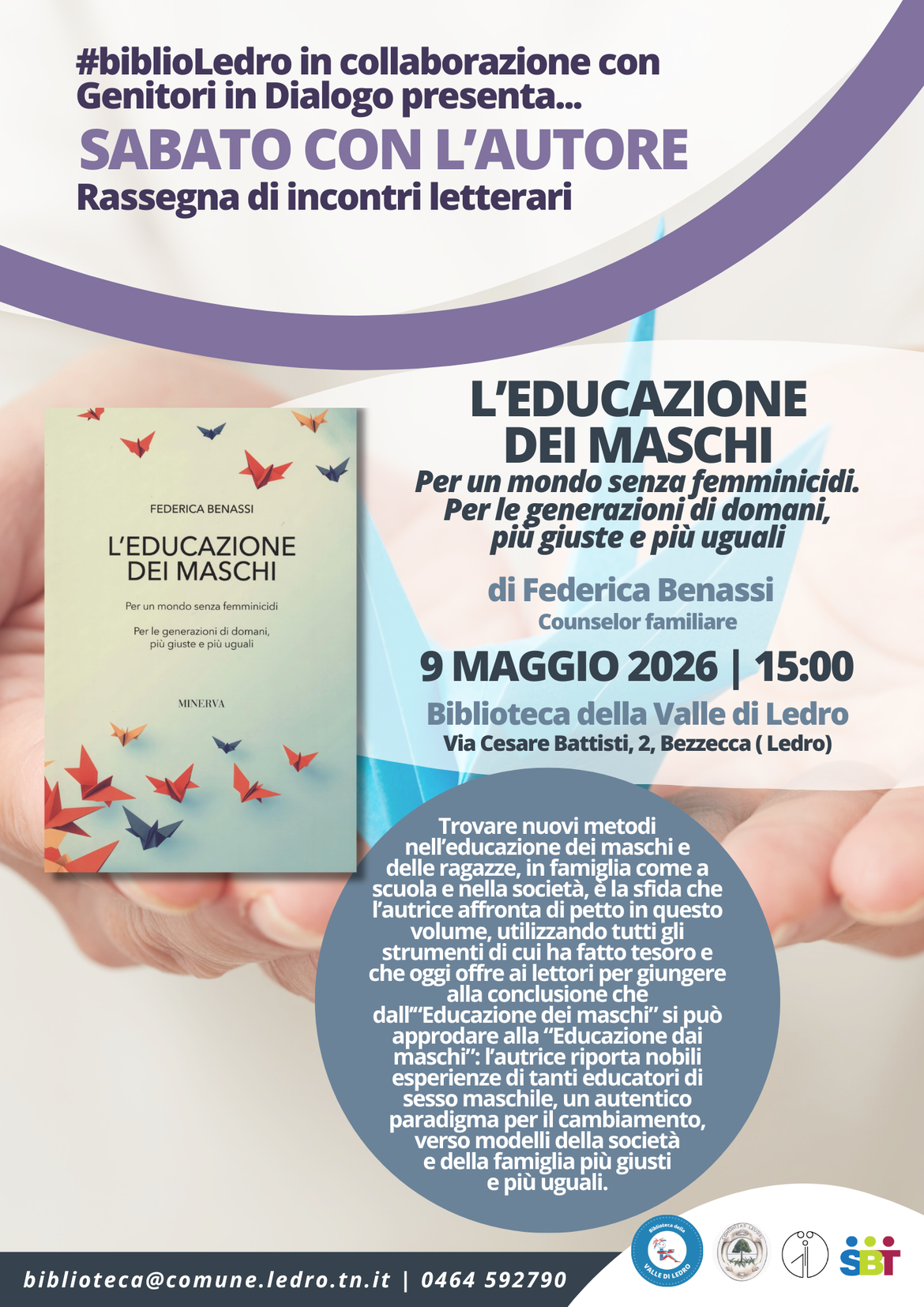 L'ultimo appuntamento della rassegna di incontri letterari SABATO CON L'AUTORE, organizzato organizzato in collaborazione con l'associazione Genitori in dialogo, vedrà come protagonista la counselor Federica Benassi con il suo libro "L'educazione dei maschi. Per un mondo senza femminicidi. Per le generazioni di domani, più giuste e più uguali."