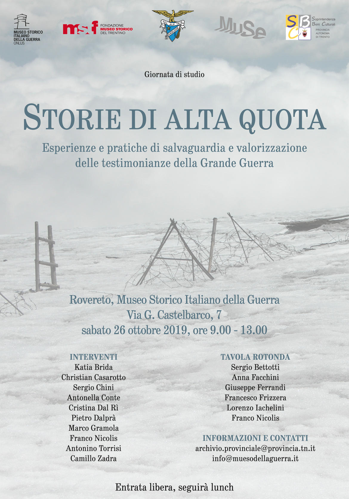A conclusione dell'evento centenario dedicato alla Grande Guerra, la Società degli Alpinisti Tridentini e la Soprintendenza per i beni culturali, in collaborazione con il Museo storico italiano della Guerra di Rovereto e la Fondazione Museo storico del Trentino, propongono una giornata di studio e confronto incentrato sulle molteplici attività di recupero, salvaguardia e ripristino delle vestigia della Grande Guerra ubicate alle alte quote e sui ghiacciai del nostro territorio. A corredo dell'incontro è prevista una tavola rotonda di sintesi e riflessione sulle prospettive future di frequentazione e fruizione ci questo consistente patrimonio di storia e memoria