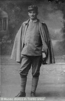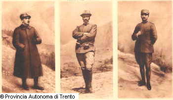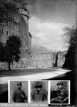 RITRATTI DI FABIO FILZI, CESARE BATTISTI E DAMIANO CHIESA. SULLO SFONDO, LA FOSSA DELLA CERVARA...