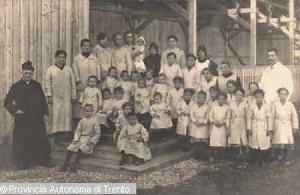- BRAUNAU (AUSTRIA). GRUPPO DI BAMBINI IN CONVALESCENZA INSIEME AI RESPONSABILI DEL REPARTO TRA CUI DON CARLO BRACHETTI. 1915-1918
