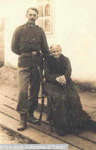 - KATZENAU, LIENZ (AUSTRIA). UOMO IN DIVISA MILITARE ACCANTO AD UNA DONNA ANZIANA SEDUTA ACCANTO AD UNA BARACCA DEL CAMPO DI INTERNAMENTO