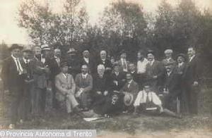 KATZENAU, LIENZ (AUSTRIA). GRUPPO DI INTERNATI, SULLO SFONDO IL RETICOLATO IN FILO SPINATO DEL CAMPO DI INTERNAMENTO. AGO 1915