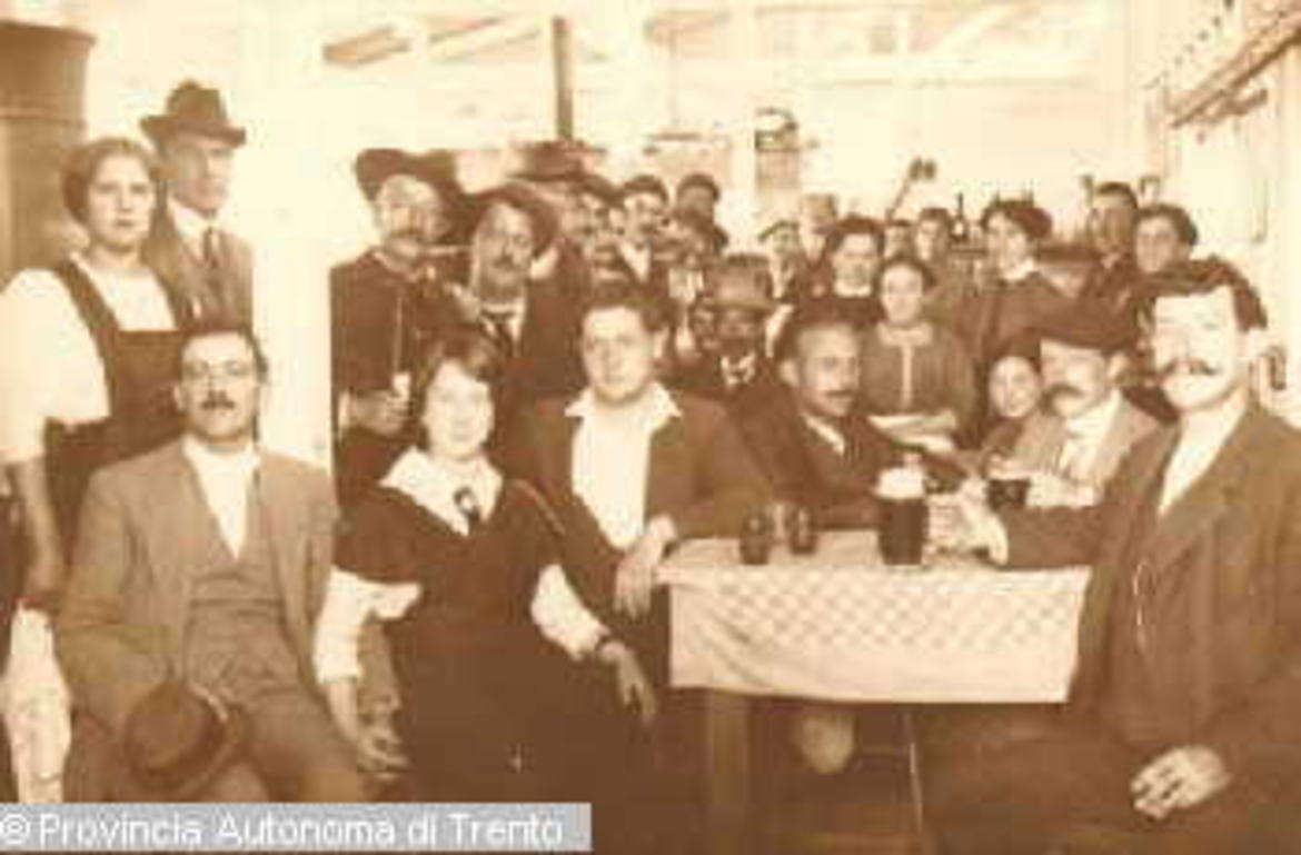 - KATZENAU, LIENZ (AUSTRIA). GRUPPO DI INTERNATI SEDUTI ALL'INTERNO LA BARACCA ADIBITA A BIRRERIA. 1915-1918