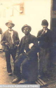 - KATZENAU, LIENZ (AUSTRIA). TRE INTERNATI PRESSO L'INGRESSO AD UNA BARACCA, SI RICONOSCE ANTONIO PESAVENTO DI ASIAGO. 1915-1918