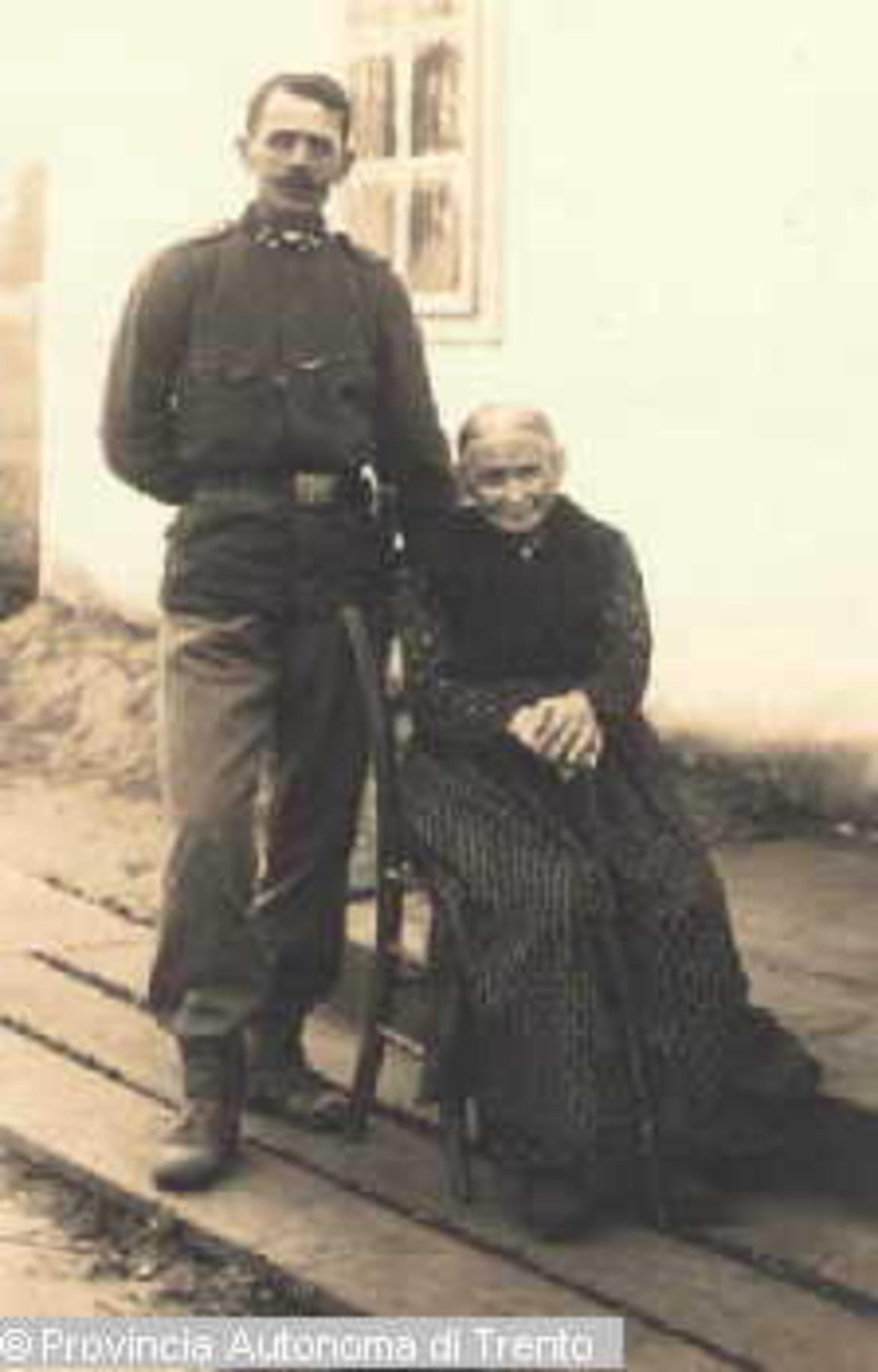 KATZENAU, LIENZ (AUSTRIA). UOMO IN DIVISA MILITARE ACCANTO AD UNA DONNA ANZIANA SEDUTA ACCANTO AD UNA BARACCA DEL CAMPO DI INTERNAMENTO. 1915-1918