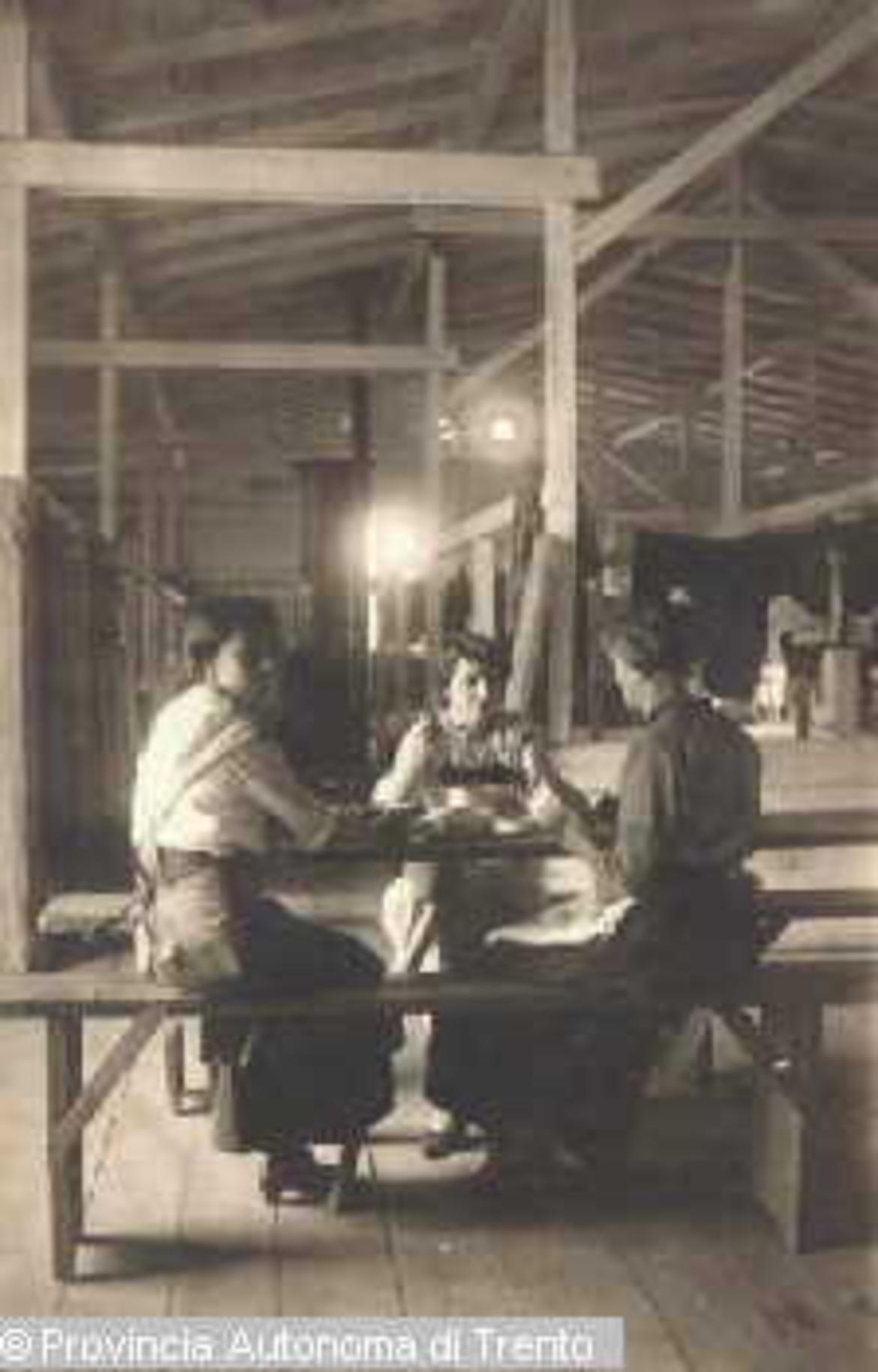 KATZENAU, LIENZ (AUSTRIA). INTERNO DELLA BARACCA 20 DEL CAMPO DI INTERNAMENTO, AL CENTRO TRE DONNE MANGIANO AD UN TAVOLO. 1915-1918