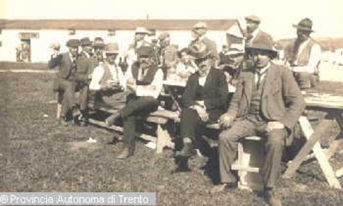 KATZENAU, LIENZ (AUSTRIA). GRUPPO DI INTERNATI, CON DELLE BOCCE IN MANO, ATTORNO AD UN TAVOLO ALL'APERTO, SULLO SFONDO BARACCHE DEL CAMPO DI INTERNAMENTO. 1915
