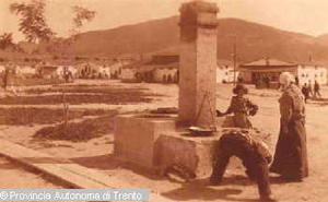 - KATZENAU, LIENZ (AUSTRIA). UN UOMO UNA DONNA E UN ABAMBINA PROFUGHI ATTORNO AD UN FOCOLARE ALL'APERTO, SULLO SFONDO LE BARACCHE DEL CAMPO DI INTERNAMENTO
