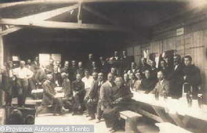 - MITTERNDORF (AUSTRIA). GRUPPO DI INTERNATI, TRA CUI SACERDOTI E FRATI, ATTORNO AL TAVOLO APPARECCHIATO ALL'INTERNO DELLA BARACCA, SI RICONOSCE FRANCESCO GOTTARDI. 1915-1918