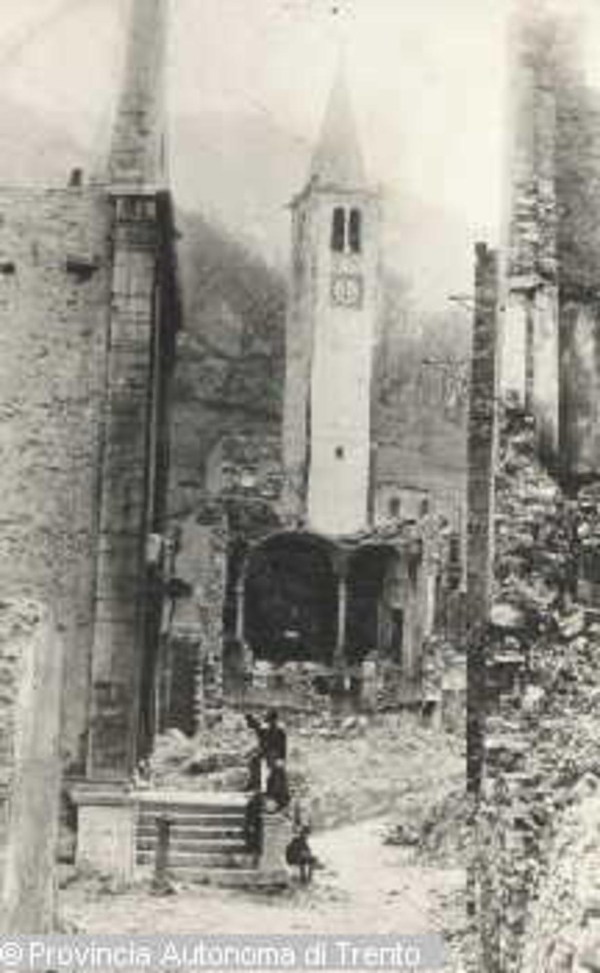 CASTEL TESINO (TN). LA CHIESA E LE CASE DEL PAESE BOMBARDATE