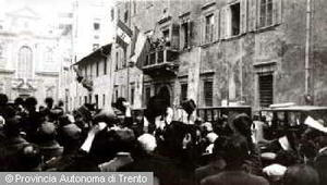 TRENTO, VIA BELENZANI. FOLLA ESULTANTE DAVANTI AL MUNICIPIO, IL RE PARLA DAL BALCONE. 7 NOV. 1918