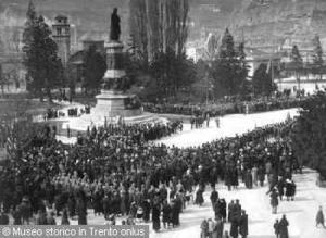 - TRENTO, PIAZZA DANTE. FOLLA E SCHIERAMENTO DI MILITARI IN OCCASIONE DELLA CERIMONIA PER L'ANNESSIONE A FIUME. 16 MAR. 1924