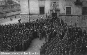 - TRENTO, CASTELLO DEL BUONCONSIGLIO. FOLLA DAVANTI AL PORTONE D'INGRESSO IN OCCASIONE DELLA CONSEGNA DELLA MEDAGLIA RICORDO AL COMITATO ONORANZE VOLONTARI