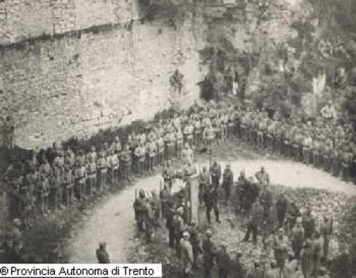 - TRENTO. CASTELLO DEL BUONCONSIGLIO. FOSSA DELLA CERVARA. CESARE BATTISTI DURANTE LA LETTURA DELLA SENTENZA DI CONDANNA A MORTE PRIMA DELL'ESECUZIONE. 1916 LUG. 12