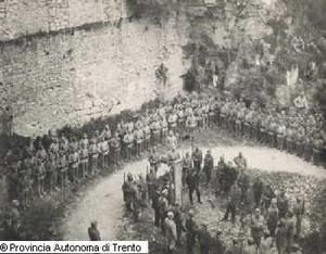 TRENTO. CASTELLO DEL BUONCONSIGLIO. FOSSA DELLA CERVARA. CESARE BATTISTI DURANTE LA LETTURA DELLA SENTENZA DI CONDANNA A MORTE PRIMA DELL'ESECUZIONE. 1916 LUG. 12