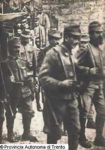 - TRENTO, CASTELLO DEL BUONCONSIGLIO, FOSSA DELLA CERVARA. CESARE BATTISTI SCENDE LE SCALE DELLA FOSSA SEGUITO DAL CAPPELLANO MILITARE. 1916 LUG. 12
