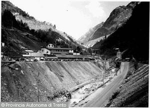 - Cantiere per la costruzione di una galleria e carrelli per lo scarico del materiale di scavo lungo gli argini di un torrente di montagna