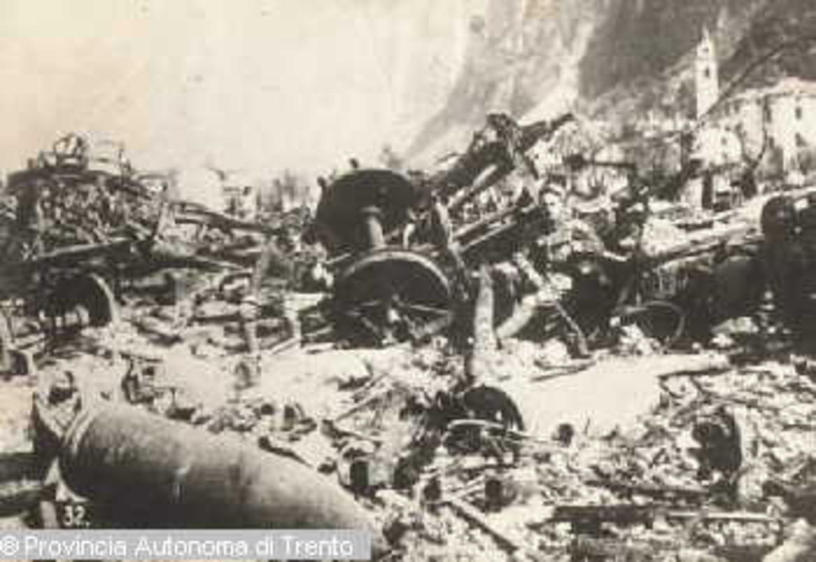 - TEZZE (VI). DEPOSITO DI MUINIZIONI E PROIETTILI ESPLOSI, SEDUTI DUE UOMINI IN DIVISA MILITARE ITALIANA. 1914-1918