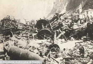TEZZE (VI). DEPOSITO DI MUINIZIONI E PROIETTILI ESPLOSI, SEDUTI DUE UOMINI IN DIVISA MILITARE ITALIANA. 1914-1918