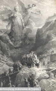 - DISEGNO RAFFIGURANTE UNA COLONNA DI AUTOMEZZI MILITARI FIAT LUNGO UNA STRADA DI MONTAGNA, LA FIGURA ALLEGORICA DELL'ITALIA SOVRASTA L'IMMAGINE. 1915-1918