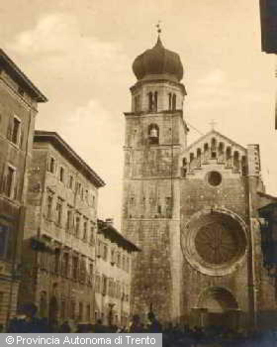 - TRENTO, VIA VERDI. VEDUTA DELLA FACCIATA DEL DUOMO, FOLLA LUNGO LA VIA. 17 NOV. 1920