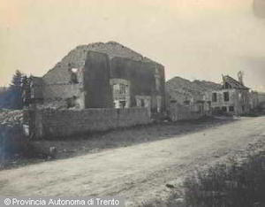 - VEDUTA DI UNA VIA DI PAESE, EDIFICI GRAVEMENTE DANNEGGIATI DAI BOMBARDAMENTI, SI DISTINGUONO ALCUNI UOMINI IN DIVISA MILITARE